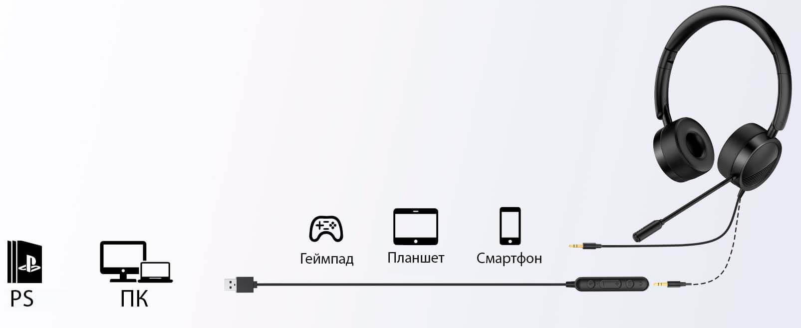 Гарнитуру можно подключить через аудио разъем 3,5 мм или USB. Работает для систем Windows 2000/7/8/10/XP/Vista, Android и macOS. Идеально подходит для проведения совещаний в TrueConf, Zoom, Skype, Google Meets и т.д.