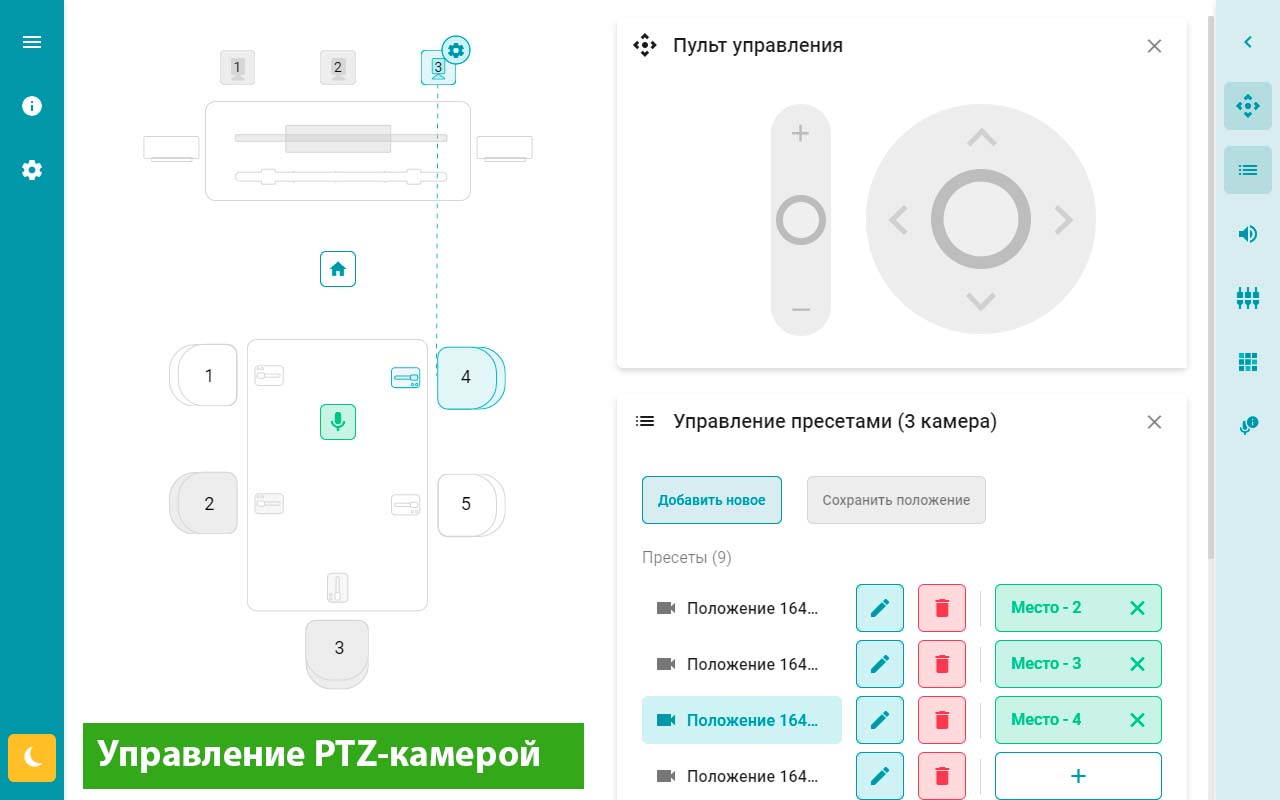 - Автоматическое переключение между сохранёнными пресетами PTZ-камер в зависимости от активации спикером микрофона конференц-системы.