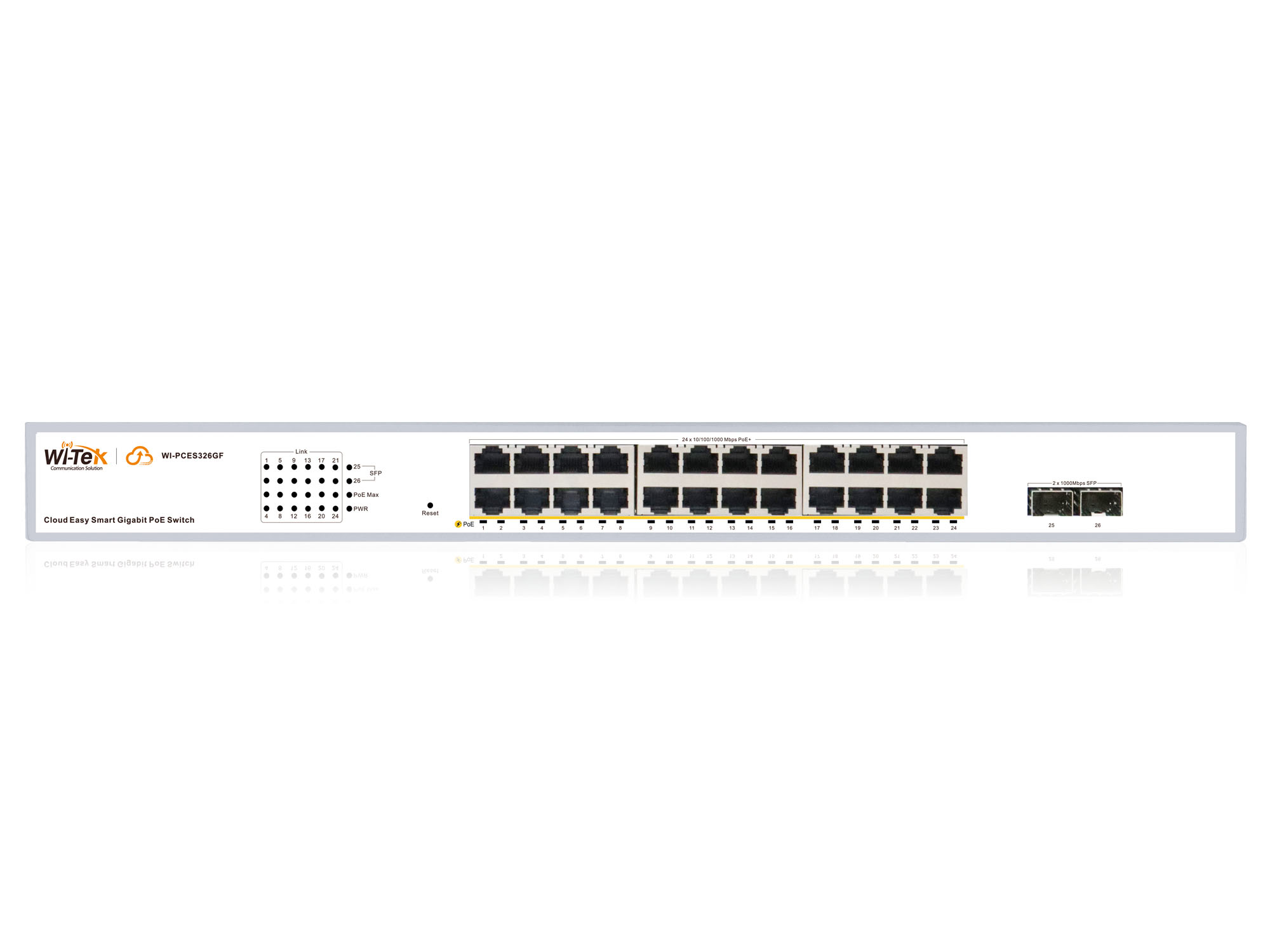 Коммутатор имеет 2 порта Uplink стандарта SFP Gigabit и 24 порта Gigabit Ethernet с поддержкой PoE стандарта 802.3af/at (PoE, PoE+) с бюджетом 370 Вт. Коммутатор поддерживает настройку через веб-интерфейс и Wi-Tek Cloud 2.0.