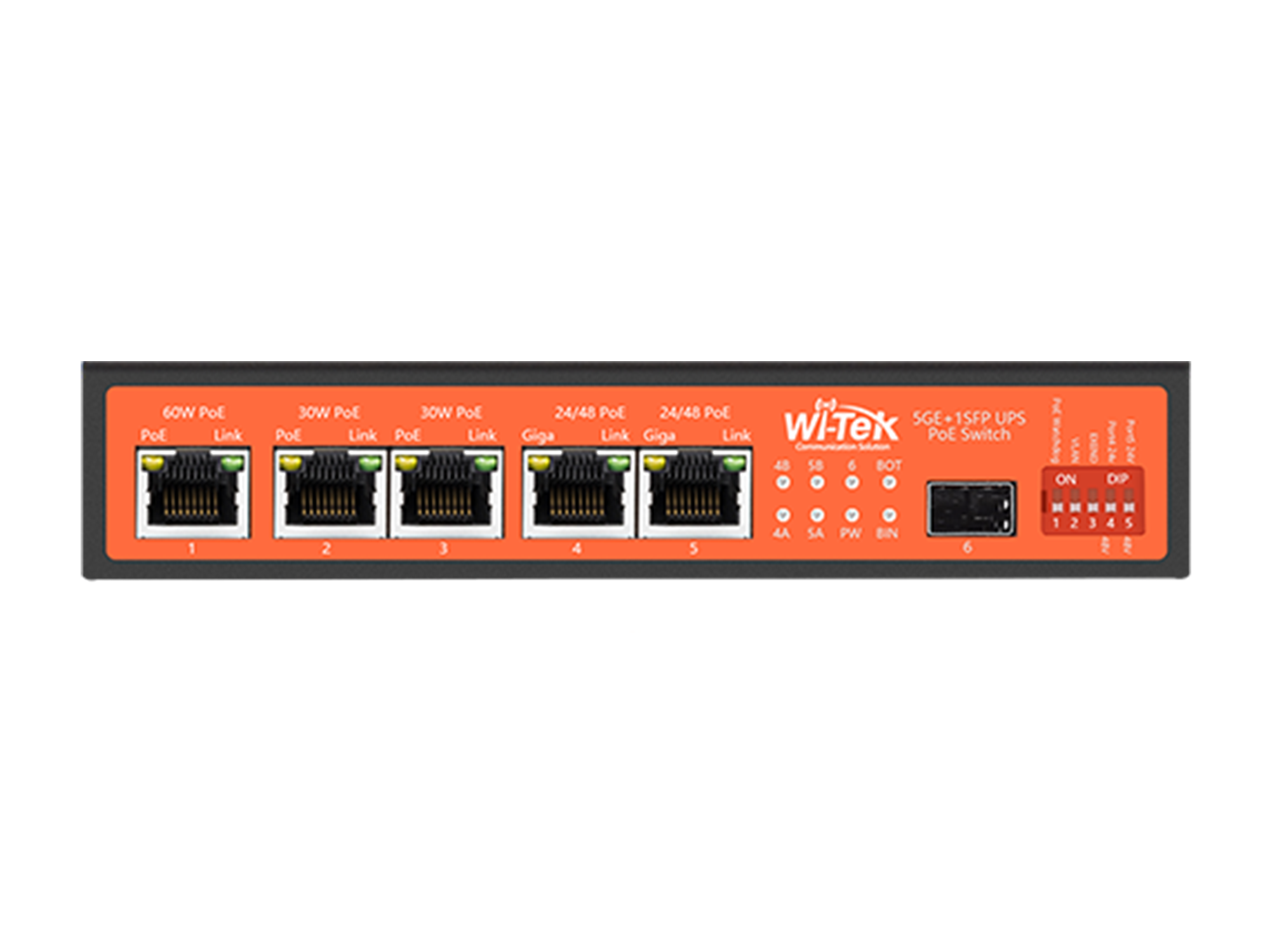 Коммутатор оснащен пятью портами 1000Base-T, которые поддерживают современную технологию Power over Ethernet (PoE), и одним портом SFP для передачи данных на большие расстояния. Продуманная система распределения питания позволяет подключать широкий спектр устройств: первый порт обеспечивает бюджет мощности до 60 Вт для ресурсоемкого оборудования, например, поворотных PTZ-камер с обогревом или мощных Wi-Fi-мостов. Порты 2 и 3 поддерживают до 30 Вт для стандартных устройств 802.3at/af, в то время как порты 4 и 5 предлагают гибкость, переключаясь между 802.3at/af (до 30 Вт) и 24V Passive PoE (до 24 Вт).