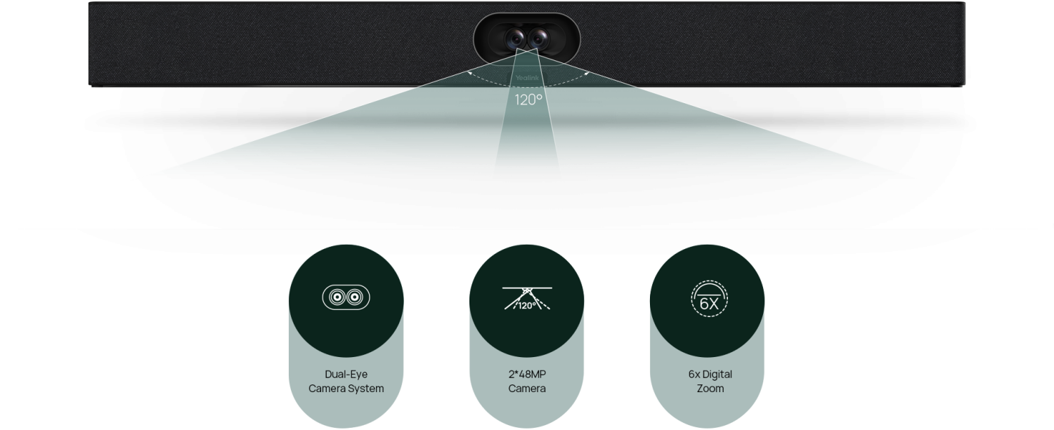 Видеобар оснащён двойной камерой с разрешением 48 МП, что обеспечивает сверхчёткое изображение даже на больших расстояниях. Широкий угол обзора 120° позволяет охватить всех участников встречи, включая тех, кто сидит в углу комнаты. Благодаря этому каждый участник будет виден на экране без искажений.