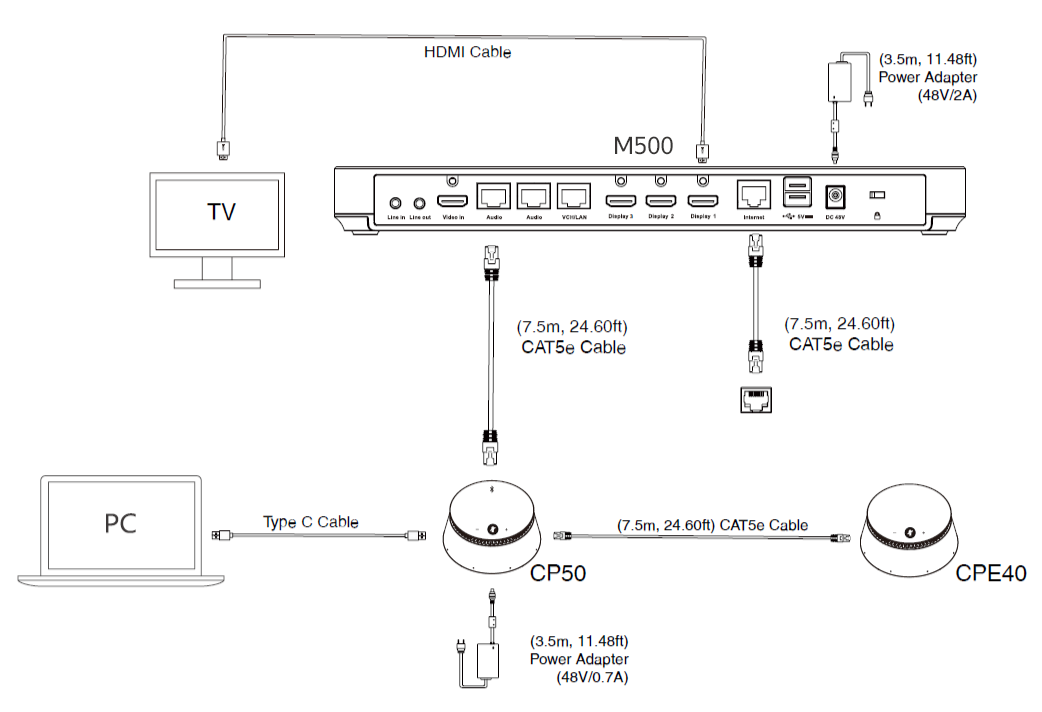 До 8 устройств можно подключить каскадом с помощью кабеля POE, чтобы удовлетворить потребности в звукоусилении в конференц-залах разных размеров, эффективно предотвращая резкие изменения громкости звука и обеспечивая бесперебойную связь (при подключении 4 и более устройств CP50 с CPE40, необходимо использовать дополнительный блок питания DC 48V/2A).